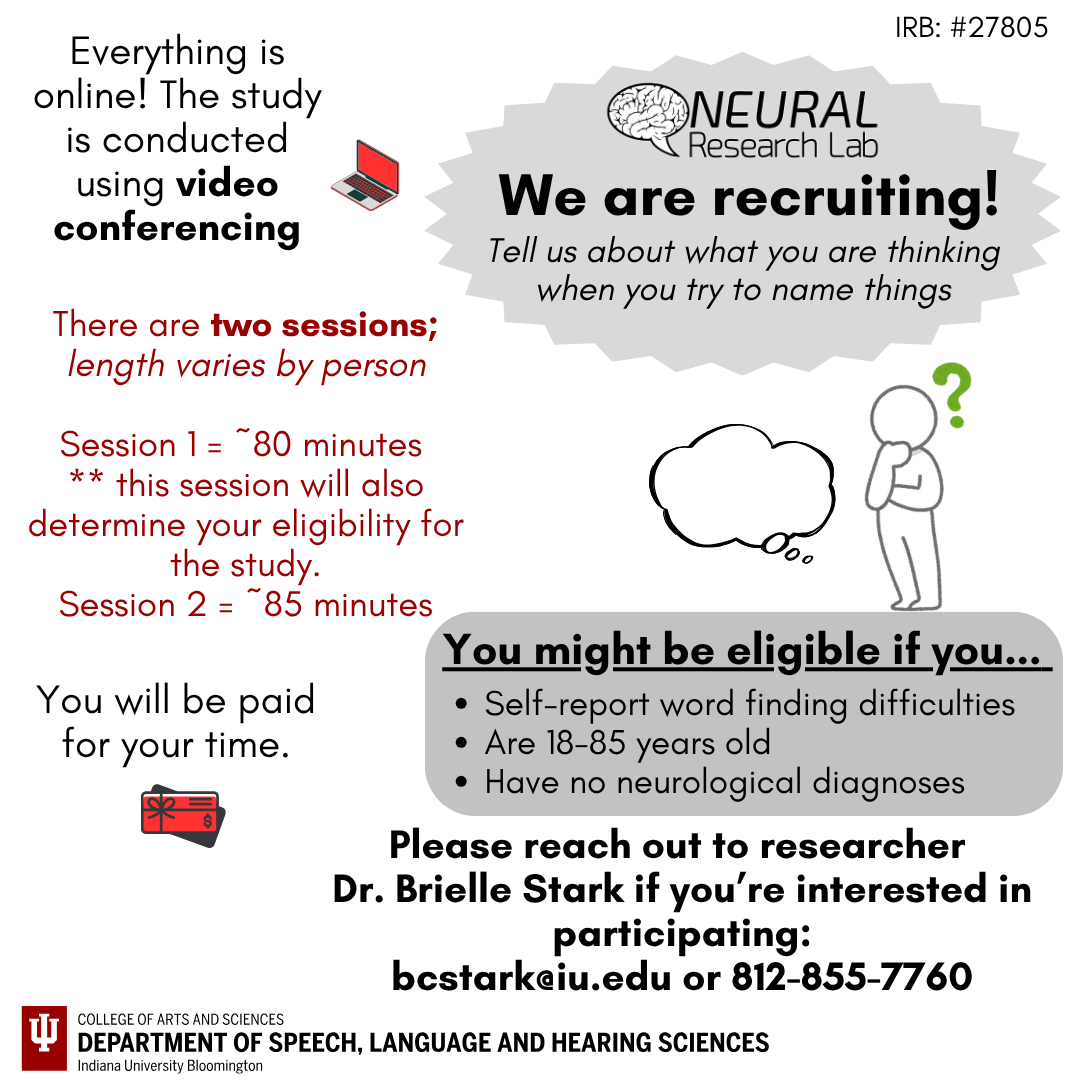 This study thinks about how we talk to ourselves in our head -- inner speech -- and its relationship to naming. A group of participants who have aphasia due to a stroke, and a group of aging adults (>55 years old) who self-report that they have trouble finding words in their everyday lives, are wanted to participate. Scroll down for ads and more information. Contact Yin Sun, yinsun@iu.edu, if you are interested.
